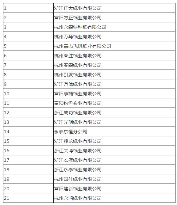 浙江富陽(yáng):已關(guān)停至少21家紙企,江南區(qū)塊造紙企業(yè)全部騰退 6月22日,杭州市人民政府辦公廳關(guān)于印發(fā)《杭州市2017年大氣污染防治實(shí)施計(jì)劃》,明確了杭州市2017年治理大氣污染的主要任務(wù),杭州市明確表示,“2017年富陽(yáng)區(qū)要啟動(dòng)江南區(qū)塊新城建設(shè),五年內(nèi)實(shí)現(xiàn)江南區(qū)塊造紙、化工等相關(guān)企業(yè)全部騰退”。 在該政策引導(dǎo)下,富陽(yáng)地區(qū)造紙企業(yè)已陸續(xù)退出,從2018年初至今,富陽(yáng)已經(jīng)有至少21家造紙企業(yè)完全關(guān)停,包括原來(lái)永正控股下屬的多家造紙廠以及其他企業(yè),關(guān)停的總產(chǎn)能約195萬(wàn)噸,以涂布白板紙為主,還有少量的紗管紙和高強(qiáng)瓦楞紙。 富陽(yáng)已關(guān)停企業(yè)名單(不完全統(tǒng)計(jì))