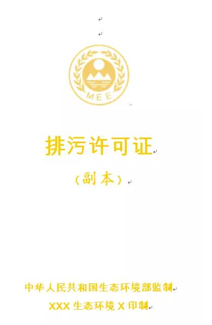 關于發布排污許可證承諾書樣本、排污許可證申請表和排污許可證格式的通知 各省、自治區、直轄市環境保護廳(局),新疆生產建設兵團環境保護局: 依據《排污許可管理辦法(試行)》,我部組織制定了排污許可證承諾書(樣本)、排污許可證申請表(試行)及排污許可證格式(具體見附件1-3)。現印發給你們,請遵照執行。 本通知發布后,《關于印發〈排污許可證管理暫行規定〉的通知》(環水體〔2016〕186號)廢止。 附件:1.承諾書(樣本) 2.排污許可證申請表(試行) 3.排污許可證格式 生態環境部 2018年8月17日 抄送:機關各部門,環境工程評估中心。 生態環境部辦公廳2018年8月20日印發 證書樣本: 正本: 1、ZHB標志改成MEE標志 2、監制單位也由環境保護部改成生態環境部