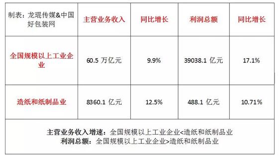 由上面數據對比可得出: 1、造紙和紙制品業主營業務收入增速高于全國規模以上工業企業主營業務收入增速,即造紙和紙制品主營業務收入增速超過了平均線。 2、造紙和紙制品業利潤總額增速低于全國規模以上工業企業利潤總額增速,即造紙和紙制品業利潤總額增速低于平均線。