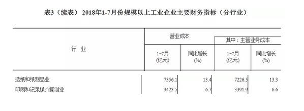 為全面了解造紙和紙制品業的運營情況,9月5日,筆者通過國家統計局查詢到了2018年1-7月份,造紙和紙制品業的主營業務收入、主營業務成本、利潤總額等數據。 分析后得知,當前造紙和紙制品業主營成本增速較高,再加上目前行情不行,企業負擔較重。不過,隨著2018年淘寶天貓雙十一招商報名規則的公布,今年的旺季將逐步開啟,造紙和紙制品業的負擔或將有所減輕。 1-7月份,造紙和紙制品業主營業務成本同比增長13.3% 1-7月份,全國規模以上工業企業實現主營業務收入60.5萬億元,同比增長9.9%,實現利潤總額39038.1億元,同比增長17.1%。值得一提的是,主營業務收入利潤率為6.46%,同比提高0.4個百分點。