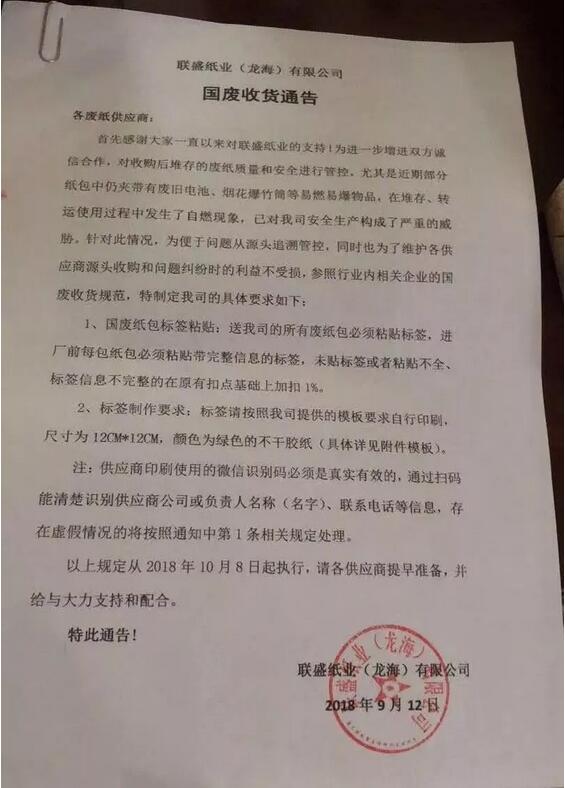 福建漳州聯(lián)盛紙業(yè)(龍海)有限公司,國廢收貨通告。