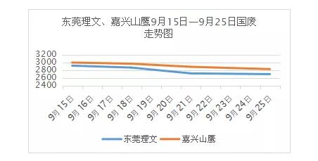 在中秋前的一個禮拜,國廢價格已是一瀉千里,有些廠家一天內甚至多次下調。我們以東莞理文和嘉興山鷹為例,如下圖。兩家中秋節前一個禮拜黃板紙A級均在3000左右,在此之后不斷下跌,截至中秋節后第一天其價格已跌去接近200。