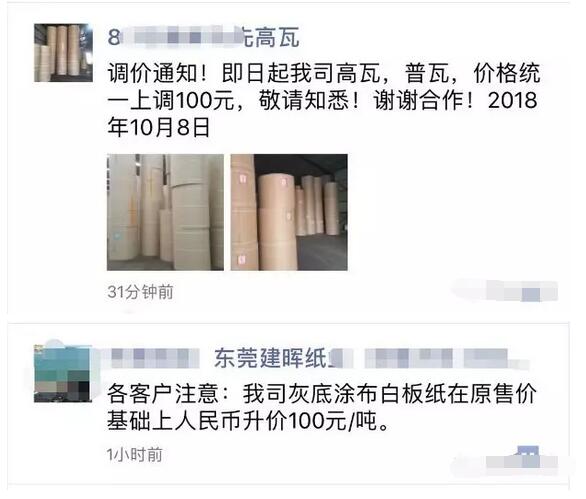 廣東省汕頭市萬欣紙業有限公司:自2018年10月5日中午12:00開始,三層紙板價格每平方上調0.06元;四層紙板價格每平方上調0.08元;五層紙板價格每平方上調0.10元;六層紙板價格每平方上調0.12元;七層紙板價格每平方上調0.14元。等通知生產的訂單一律不接。
