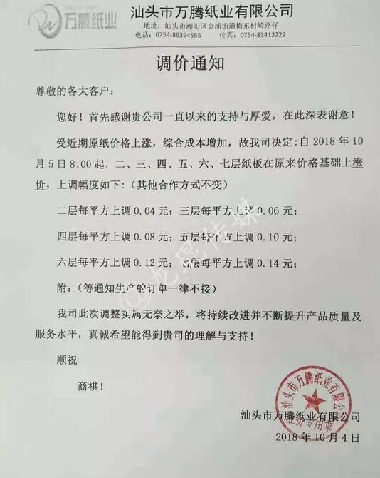 汕頭市萬騰紙品實業有限公司:從2018年10月5日8點起,二層紙板價格每平方上調0.04元;三層紙板價格每平方上調0.06元;四層紙板價格每平方上調0.08元;五層紙板價格每平方上調0.10元;六層紙板價格每平方上調0.12元;七層紙板價格每平方上調0.14元。等通知生產的訂單一律不接。