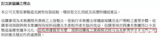 我們從玖龍紙業曾發布的公告里能發現一些蛛絲馬跡,“收購事項為本集團現有業務之上游整合,是執行本集團全球范圍采購及客戶策略的重要步驟。收購事項預期將與本集團現有原料采購及生產程序產生協同效益。同時使集團得以令其制造基礎更趨多元化,并取得優質原木漿,預期收購后的業務模式將為集團提供更可靠的材料供應及穩定的長遠發展!