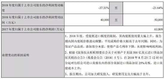 凈利潤大幅下滑的情況可能還會(huì)延續(xù)至全年。報(bào)告顯示,景興紙業(yè)預(yù)計(jì),2018年1-12月歸屬上市公司股東的凈利潤為4.00億至5.00億,同比變動(dòng)-37.31%至-21.64%。