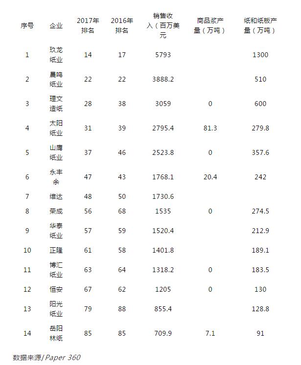 美國paper360雜志根據2017年(部分企業為財年)企業營業收入為依據,公布了最新的全球紙業100強名單,美國的三家企業國際紙業、P&G和WestRock位列前三,日本的Oji,芬蘭的UPM緊隨其后。 小編整理榜單發現,共有14家中國企業進入全球100強,其中9家企業的排名都比前一年有所提高。玖龍紙業排名中國企業第一,2017年營業收入達到5793百萬美元,晨鳴紙業、理文造紙、太陽紙業和山鷹紙業位列第二到第五位。