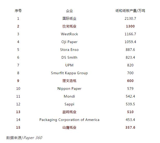 報告還公布了全球57家紙機紙板產量超過100萬噸的造紙企業名單,國際紙業排名第一,玖龍紙業和WestRock位列二、三位。有四家中國企業產量進入全球前15強,分別是玖龍紙業、理文造紙、晨鳴紙業和山鷹紙業。