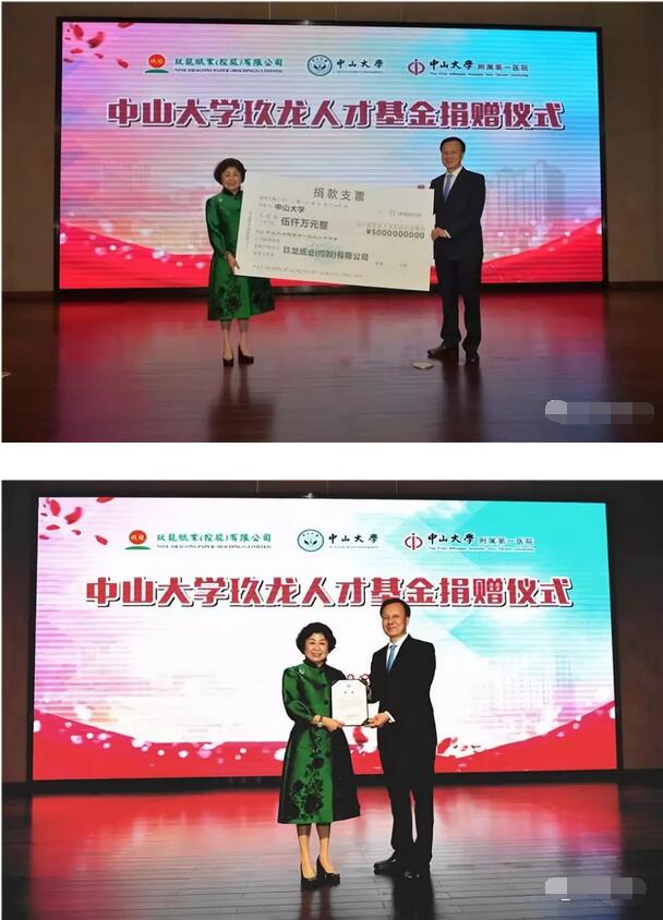 10月26日下午,玖龍紙業(yè)向中山大學(xué)附屬第一醫(yī)院捐贈5000萬元設(shè)立人才基金,支持該院人才發(fā)展。中山大學(xué)副校長、醫(yī)院院長肖海鵬,黨委駱騰書記等院領(lǐng)導(dǎo),玖龍紙業(yè)董事長張茵女士等出席捐贈儀式。