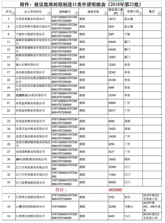 11月1日,固廢中心公布的2018年第23批限制進口類申請明細表顯示,共通過16家企業,廢紙核定進口總量為46.566萬噸。此外江蘇理文2762噸為第222號更改口岸、江西理文4443噸為第212號更改口岸,山鷹國際22200噸為第495、496號變更。
