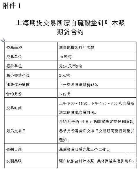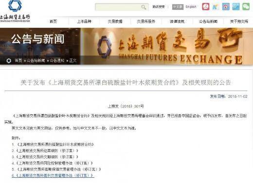 上期所官網于11月2日發布了關于發布《上海期貨交易所漂白硫酸鹽針葉木漿期貨合約》及相關規則的公告。發布的合約及規則包括《上海期貨交易所漂白硫酸鹽針葉木漿期貨合約》、《上海期貨交易所結算細則(修訂案)》、《上海期貨交易所交割細則(修訂案)》、《上海期貨交易所風險控制管理辦法(修訂案)》、《上海期貨交易所套期保值交易管理辦法(修訂案)》和《上海期貨交易所套利交易管理辦法(修訂案)》。