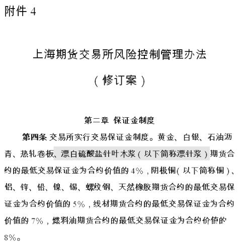 發布的內容顯示,交易品種漂白硫酸鹽針葉木漿的交易單位為10噸/手,最小變動價位為2元/噸,漲跌停板幅度為上一交易日結算價±3%。同時,《上海期貨交易所風險控制管理辦法》(修訂案)規定,漂白硫酸鹽針葉木漿期貨合約的最低交易保證金為合約價值的4%。