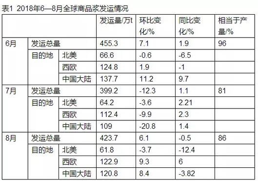 從表1可以看出,7月份商品漿國際交易量大減,世界貿(mào)易摩擦、漿價居高不下,以及中國大陸的廢紙進口限制等,均成為影響當月商品漿裝船量驟減的重要因素。 在亞洲市場,7月商品漿報價基本維持穩(wěn)定,有一部分短纖漿的現(xiàn)貨價格略有提升。8月,亞洲市場商品漿出現(xiàn)大幅降價,其中長纖漿在中國大陸市場價格下降達50美元/t,而短纖漿報價則維持平穩(wěn);但也有一說是為了應(yīng)對中美貿(mào)易戰(zhàn)的影響,7月長纖漿價先上漲了20美元/t,8月再進一步調(diào)降30美元/t。在中國大陸以外的其他亞洲市場,包括中國臺灣、日本、韓國等,長纖漿價格下降了30美元/t,短纖漿價持平。 9月,包括中國大陸在內(nèi)的亞洲市場,長纖漿價又呈現(xiàn)反彈走勢,每噸價格上漲20美元,達到880~935美元/t(多數(shù)在890美元/t左右);而短纖漿價格則大致平穩(wěn),約在780~800美元/t之間。 在歐美市場,尤其是美國市場,旺盛的需求帶動第3季度商品漿報價一路上漲。歐洲市況稍弱于北美市場(含美國市場),7—9月份商品漿價基本維持穩(wěn)定,其中長纖漿報價約1,230美元/t;短纖漿報價則約1,050美元/t。