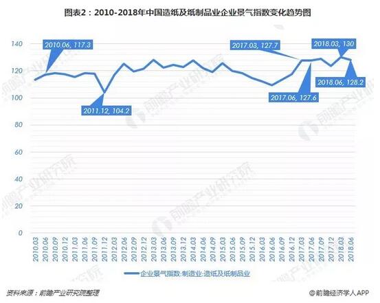 從國家統計局的行業景氣指數來看,2010年以來我國造紙及紙制品業的企業景氣指始終高于100,2017年一季度開始景氣指數始終在120以上。2018年一季度景氣指數為130,2018上半年景氣指數為128.2。我國造紙行業景氣度持續向好。