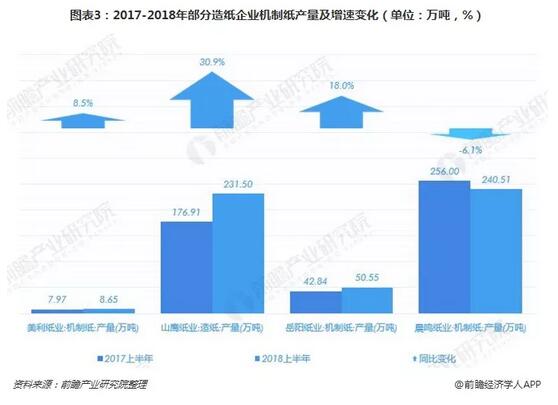 在環保政策的持續影響下,我國龍頭造紙企業優勢愈發凸顯,龍頭企業產銷狀況整體較好。從我國主要造紙企業的產量和銷量變化情況來看,2018年上半年美利紙業、山鷹紙業、岳陽紙業的機制紙產量均得到了不同幅度的上升,晨鳴紙業的產量略有下滑。而山鷹紙業和晨鳴紙業2018上半年的銷量分別較上年同期增長了35.2%和103.3%。
