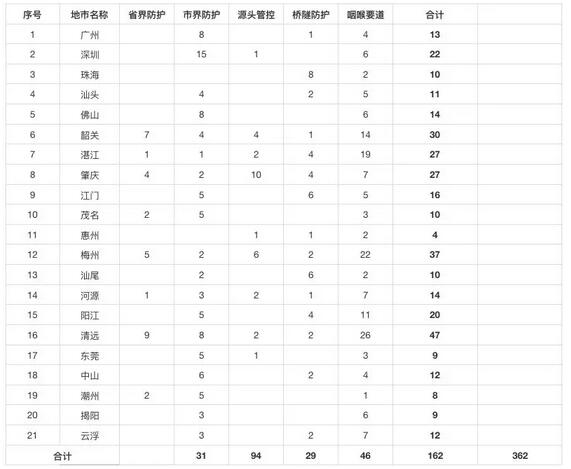 布局方案: 在2019~2023年5年內(nèi),共規(guī)劃建設(shè)廣東省治理超限超載非現(xiàn)場執(zhí)法監(jiān)測點(diǎn)362個(gè)。其中,規(guī)劃建設(shè)省界防護(hù)點(diǎn)31個(gè)、市界防護(hù)點(diǎn)94個(gè)、源頭管控點(diǎn)29個(gè)、重要橋隧檢測點(diǎn)46個(gè)、咽喉要道檢測點(diǎn)162個(gè)。 布局方案統(tǒng)計(jì)表:
