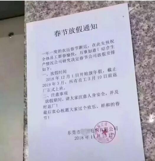 最近,朋友圈里看到了東莞某紡織工廠的春節放假通知,12月1號就開始放春節假期,3月10號才返廠上班,公司最后預祝全體員工過個歡樂祥和的春節。如果春節假期如此之長,你會高興嗎?網友評論紛紛。