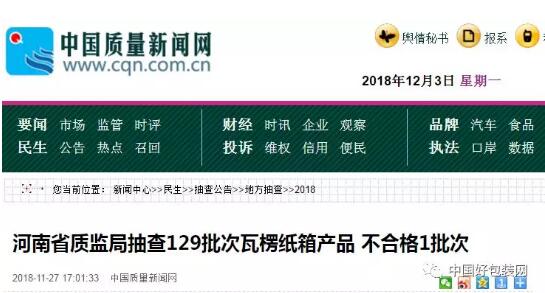 11月26日,河南省質量技術監督局官網公布了2018年第2批瓦楞紙箱產品質量監督抽查結果,1批次產品不符合標準要求。