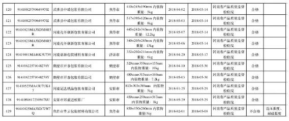 河南省質監局抽查99家企業129批次瓦楞紙箱產品,1批次產品不合格 11月26日,河南省質量技術監督局官網公布了2018年第2批瓦楞紙箱產品質量監督抽查結果,1批次產品不符合標準要求,主要涉及邊壓強度、耐破強度等。 本次抽查共抽取了鄭州、開封、洛陽、平頂山、安陽、鶴壁、新鄉、焦作、濮陽、許昌、漯河、三門峽、南陽、商丘、信陽、周口、駐馬店等15個省轄市和蘭考、汝州、鄧州、固始、新蔡等5個直管縣(市)99家企業生產的129批次瓦楞紙箱產品。 本次抽查依據GB/T6543-2008《運輸包裝用單瓦楞紙箱和雙瓦楞紙箱》及《2018年第2批瓦楞紙箱產品質量監督抽查實施方案》。對瓦楞紙箱產品的耐破強度、厚度、粘合強度、邊壓強度、尺寸公差、壓痕線、搖蓋耐折、空箱抗壓強度等項目進行了檢驗。 河南省質監局表示,已責成相關省轄市、直管縣(市)質量技術監督部門按照有關法律法規,對本次抽查中不合格產品及其生產企業依法進行處理。 2018年第2批瓦楞紙箱產品質量河南省監督抽查企業具體情況:
