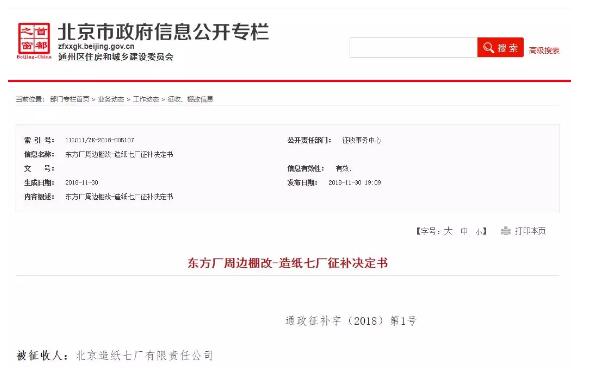 被征收人(北京造紙七廠有限責任公司)的房屋坐落于北京市通州區濱河路126號,在本次征收范圍之內。經認定,該房屋建筑面積A類:40533.88平方米;B類:9328.91平方米;C類:1128.52平方米;D類:1668.36平方米;E類:7339.77平方米;土地面積:165298.99平方米。 經評估,該處房屋價值868406577元,設備設施價值32067665元,評估報告已送達,被征收人未在規定期限內提出書面復核申請。 房屋征收部門北京市通州區人民政府房屋征收辦公室與被征收人在征收補償方案確定的簽約期限內達不成補償協議。現通州區人民政府依據《國有土地上房屋征收與補償條例》第二十六條、《北京市國有土地房屋征收與補償實施意見》、《東方廠周邊棚改項目(小圣廟村域范圍內及北京東亞鋁業公司)國有土地上非住宅房屋征收與補償方案》等作出補償決定如下: 被征收人補償款共計955879364元。其中,該房屋價值868406577元,搬遷費2493140元,臨時安置費24931395元,停產停業損失補償27923162元,移機費57425元,設備設施補償32067665元。 據區征收辦有關負責人介紹,這里將按照規劃,作為“城市綠心”的重要組成部分,將建設劇院、圖書館和博物館,不僅是未來城市的“森林之肺”,更是市民的文化中心和休閑中心。