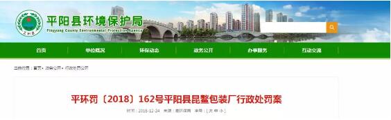 導語:浙江省溫州市平陽縣環境保護局近日發布行政處決書,平陽縣昆鰲包裝廠的經營者因擅自開工建設包裝盒、包裝袋加工項目,且項目的環境影響評價文件未經環保部門批準,被環保局責罰3萬元。