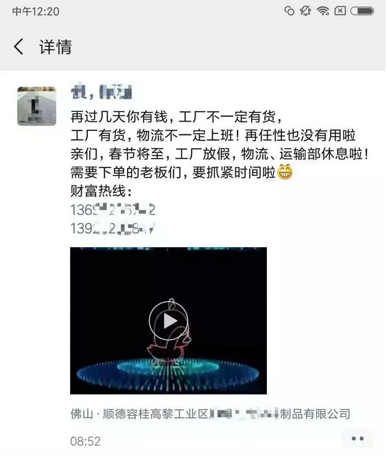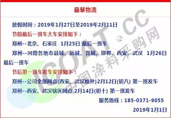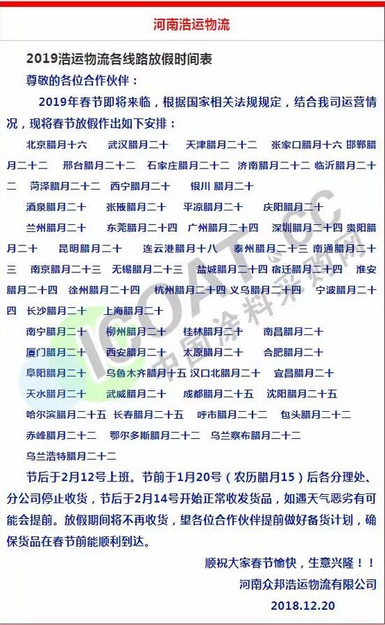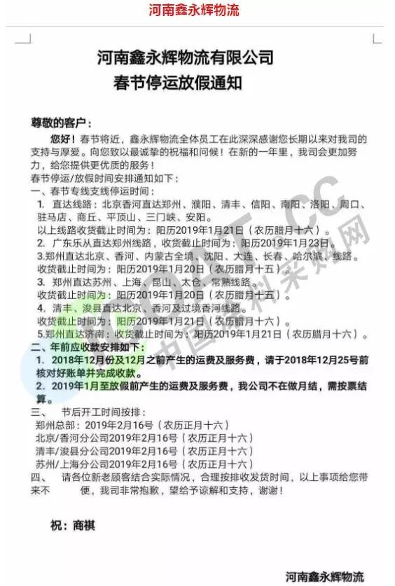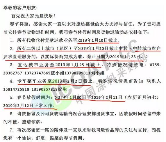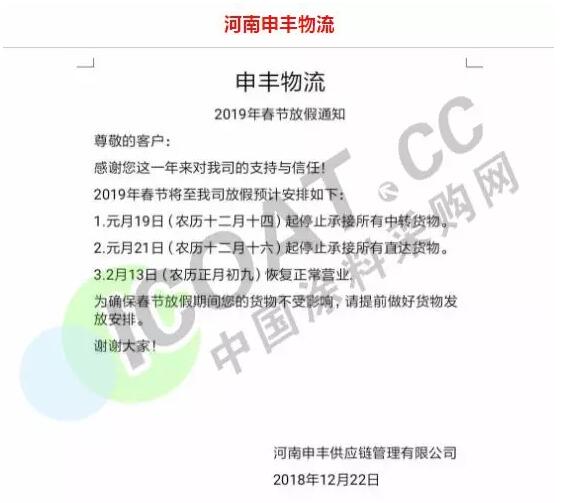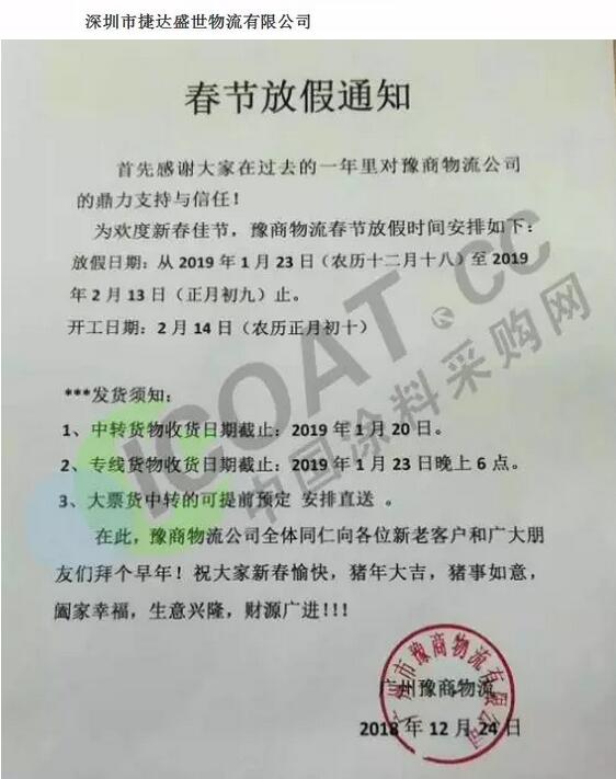 導(dǎo)語(yǔ):年關(guān)將近,很多物流公司都陸續(xù)發(fā)布了2019年春節(jié)停運(yùn)通知。大部分物流公司從1月20日起開始放假,部分甚至在1月10日、12日就停止收貨。有包裝廠也發(fā)出通知,春節(jié)將至,工廠放假,物流、運(yùn)輸休息!要下單的老板們,抓緊啦!