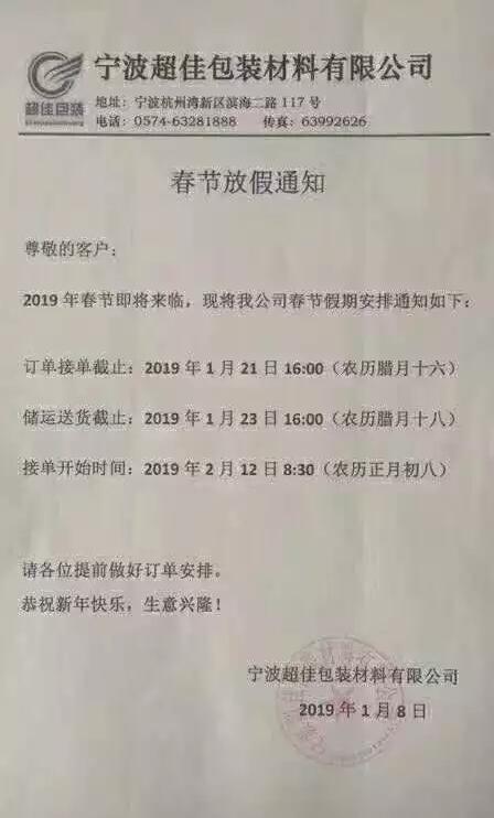 寧波超佳包裝材料有限公司:2019年春節(jié)即將來(lái)臨,現(xiàn)將我公司春節(jié)假期安排通知如下:訂單接單截止:2019年1月21日16(農(nóng)歷臘月十六);儲(chǔ)運(yùn)送貨截止:2019年1月23日16:00(農(nóng)歷臘月十八);接單開(kāi)始時(shí)間:2019年2月12日8:30(農(nóng)歷正月初八);請(qǐng)各位提前做好訂單安排!恭祝新年快樂(lè),生意興隆!