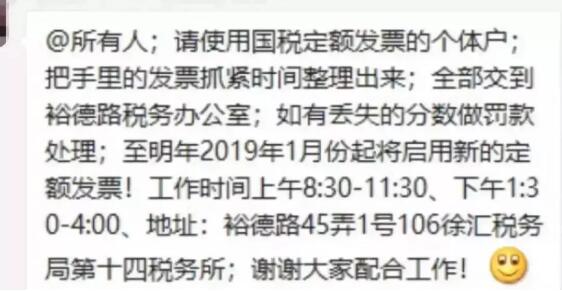 稅局具體通知 二、《國家稅務總局關于增值稅電子普通發票使用有關事項的公告》的具體通知 1、發布本公告的背景是什么? 為了保障國稅地稅征管體制改革工作順利推進,確保改革前后增值稅電子普通發票有序銜接、平穩過渡,發布本公告。 2、新稅務機構掛牌后,增值稅電子普通發票版式文件上的發票監制章有何變化? 新稅務機構掛牌后,國家稅務總局各省、自治區、直轄市和計劃單列市稅務局[以下簡稱“各省(區、市)稅務局”]將啟用新的發票監制章。增值稅電子普通發票(含收費公路通行費增值稅電子普通發票,下同)版式文件上的發票監制章,相應修改為各省(區、市)稅務局新啟用的發票監制章,納稅人自建電子發票服務平臺和第三方電子發票服務平臺需要進行相應升級。 3、新啟用的發票監制章是什么樣式? 新啟用的發票監制章形狀為橢圓型,長軸為3厘米,短軸為2厘米,邊寬為0.1厘米,內環加刻一細線,上環刻制“全國統一發票監制章”字樣,中間刻制“國家稅務總局”字樣,下環刻制“××省(區、市)稅務局”字樣,下環字樣例如:“江蘇省稅務局”、“上海市稅務局”、“內蒙古自治區稅務局”、“新疆維吾爾自治區稅務局”。字體為楷體7磅,印色為大紅色。 4、電子發票服務平臺的升級工作應當于何時完成? 納稅人自建電子發票服務平臺和第三方電子發票服務平臺的升級工作,應當于2018年12月31日前完成。 5、電子發票服務平臺升級前,發票監制章如何使用? 電子發票服務平臺升級前,生成的增值稅電子普通發票版式文件可以繼續使用原各省、自治區、直轄市和計劃單列市國家稅務局的發票監制章。 6、本公告自何時起施行? 本公告自發布之日起施行。 這些發票使用時間規定,也要注意 三、新規執行后,定額發票也不能繼續使用了嗎?請注意 網上爆出這樣一張聊天記錄,定額發票不能用了?(不對真實性負責)