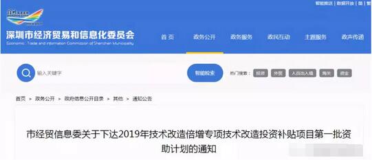 1月21日,深圳市經濟貿易和信息化委員會網發布了《2019年技術改造倍增專項技術改造投資補貼項目第一批資助計劃》。