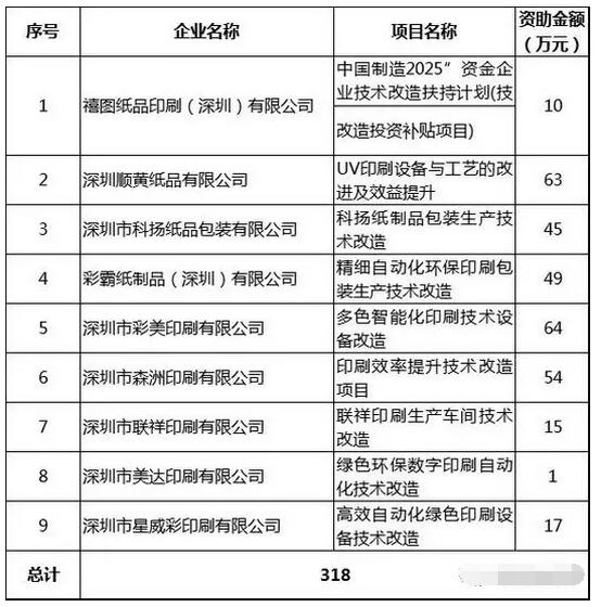根據《深圳市技術改造倍增專項操作規程》,經審核、社會公示等程序,深圳市經濟貿易和信息化委員會安排資金5434萬元對126個項目予以資助,其中,9家包裝印刷企業共獲318萬資助。