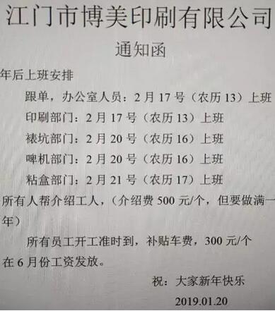江門市博美印刷有限公司:年后上班安排:跟單、辦公室人員2月17日上班,印刷部門2月17日上班,裱坑部門2月20號上班,啤機部門2月20日上班,粘盒部門2月21日上班。