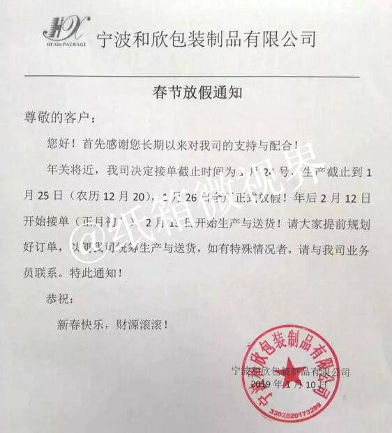 寧波和欣包裝制品有限公司: 接單截止時間為1月24號,生產截止到1月25日(農歷12月20),1月26日全廠正式放假。年后2月12日開始接單(正月初八),2月13日開始生產與送貨。