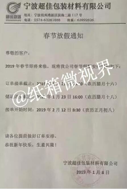 導語:截至1月22日,瓦小編了解到,至少已有12家紙板/紙箱廠發布春節放假通知。 上游漲漲漲,紙箱廠視而不見陸續放假 世界上最悲傷的事情就是明明說好的一起復習到一點半,你卻偷偷報了補習班;而對于紙箱廠,更悲傷的卻是“當我放假了,你卻漲價!薄翢o疑問,紙箱廠被上游硬擺著演了一出空城計。 然而,該配合你演出的我演視而不見,當原紙和紙板“漲漲漲”的時候,廢紙收購價卻是“跌跌跌”。一周以來已經有137家造紙廠對廢紙收購價進行了下調。這一切都是發生在紙箱廠陸續放假的最后一周。 截至1月22日,至少已有12家紙板/紙箱廠發布春節放假通知。 萍鄉市金象紙箱包裝有限公司:停止接單時間:2019年1月24日(農歷十二月二十九)預計開工時間:2019年2月12日。