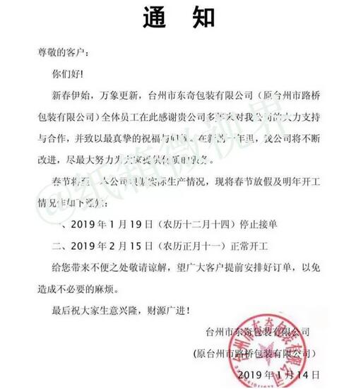 臺州市東奇包裝有限公司: 2019年1月19日(農歷十二月十四)停止接單。 2019年2月15日(農歷正月十一)正常開工。