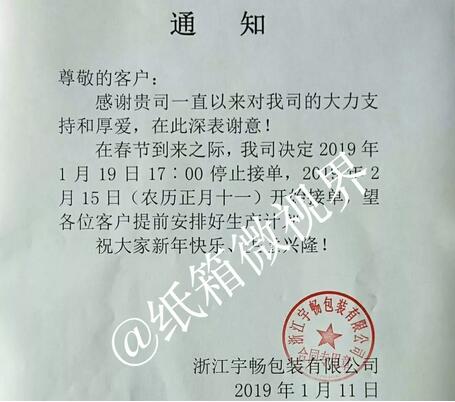 浙江宇暢包裝有限公司:1月19日17:00停止接單,2019年2月15日開始接單。