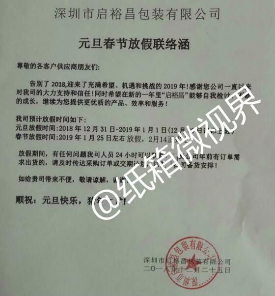 深圳市啟裕昌包裝有限公司:春節放假時間:2019年1月25日-2月14日。