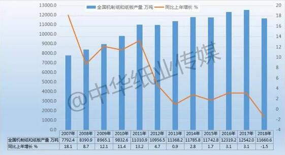 據近日國家統計局數據庫顯示,2018年1至12月我國機制紙及紙板(外購原紙加工除外,下同)累計產量為11660.6萬噸,累計增長-1.5%。這是自1998年(統計局數據庫可查詢到的數據)以來,全年機制紙和紙板產量首次出現負增長。(注:據中國造紙協會年度報告調查,2013年我國紙和紙板產量曾出現過負增長。)
