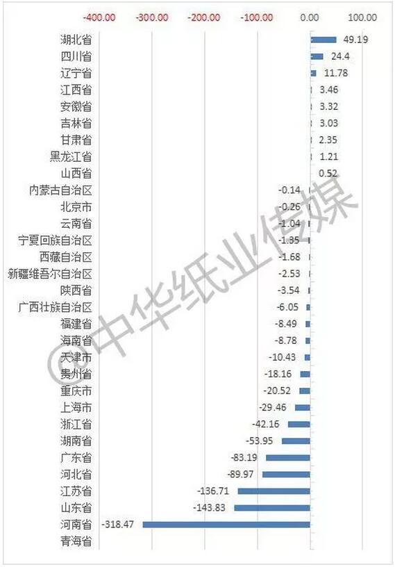 圖42018年機制紙和紙板分地區產量增長量排名(單位:萬噸)