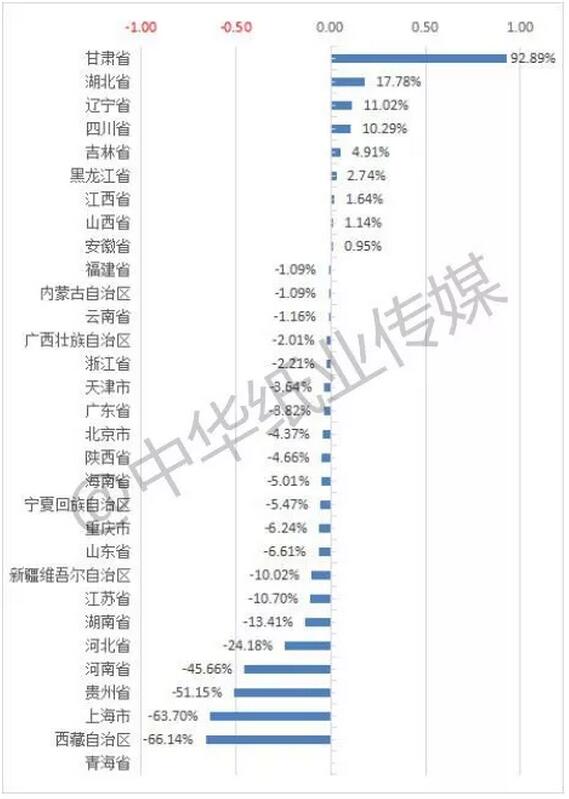 圖4、圖5是各省(市、自治區)機制紙和紙板產量2018年相對2017年變化情況。可以看出,2018年只有9個地區產量實現增長,其中湖北省增量最大,增長了近50萬噸,同時增速也排全國第二,達到了17.8%;此外四川和遼寧也實現了10萬噸以上的增長,增速也超過了10%;甘肅雖然以92.89%的增速為全國最高,但整體增長量不大。除了湖北、四川、遼寧外,其他重點機制紙和紙板產量大省都出現了比較明顯的減產,其中河南產量減少超過了300萬噸,山東和江蘇這兩個造紙大省也都出現了百萬噸以上的減產。