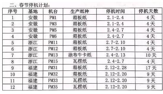 而在此前,太倉玖龍和重慶玖龍也發(fā)布了春節(jié)發(fā)貨計(jì)劃。其中,太倉玖龍?jiān)?月4日-2月10日停止發(fā)貨,重慶玖龍?jiān)?月3日-2月10日停止發(fā)貨。 不過,與其不同的是,此次山鷹紙業(yè)還發(fā)布了停機(jī)計(jì)劃,安徽、浙江、福建三大基地共計(jì)12臺箱板紙、涂布牛卡紙、瓦楞紙紙機(jī)檢修4-17天不等。