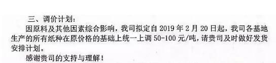 當(dāng)然,最引人關(guān)注的是,在本次通知中,山鷹紙業(yè)還宣布,自2月20日起,各基地的所有紙種統(tǒng)一上調(diào)50-100元/噸。