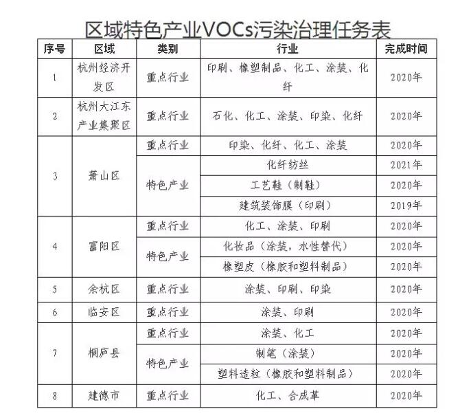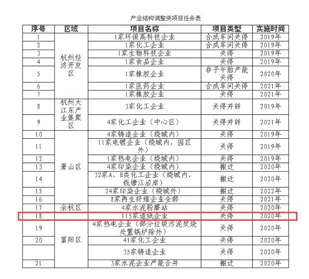 為貫徹落實黨的十九大提出的“堅持全民共治、源頭防治,持續實施大氣污染防治行動,打贏藍天保衛戰”的明確要求和市第十二次黨代會提出的建設全市域大氣“清潔排放區”的目標要求,持續改善杭州市大氣環境質量,根據《中華人民共和國大氣污染防治法》《浙江省大氣污染防治條例》《杭州市大氣污染防治規定》以及《杭州市人民政府辦公廳關于杭州市建設全市域大氣“清潔排放區”的實施意見》(杭政辦〔2017〕2號)等有關規定要求,結合杭州市市城市總體規劃、國民經濟社會發展規劃和能源發展規劃等實際情況,制定出該規劃,與造紙、印刷行業相關的內容如下: 文件表明,為持續改善杭州市的大氣環境質量, 首先需要優化產業布局。深入實施“一號工程”,做強戰略性新興產業,提升傳統優勢產業,充分發揮民營經濟優勢,加快民營經濟轉型發展。實現產業高端化、低碳化、集約化,深化“畝產論英雄”改革,到2020年,全市規模以上工業企業單位能耗增加值、單位排放增加值年均分別提高4%以上。進一步做強杭州高新開發區、杭州經濟開發區、蕭山經濟技術開發區、余杭經濟技術開發區內的優勢產業和特色產業,積極發展創新型產業和高附加值現代服務業,組團發揮各自區位優勢發展特色產業。 實施項目、總量、空間“三位一體”準入制度,嚴格控制高污染高能耗行業新增產能,根據區域大氣環境質量現狀,對各區、縣(市)實施特征污染物總量控制制度。全市生態保護紅線范圍內禁止新建污染大氣環境的生產性項目,上城、下城、江干、拱墅、西湖、濱江等六區范圍內原則上不再新建、擴建產生VOCs排放的工業項目。力爭到2020年,工業涉氣信訪重復投訴量比2017年下降30%。到2021年,完成富陽區造紙行業、杭州經濟開發區化工行業、杭州大江東產業集聚區化纖行業的關停搬遷,打造全市域和諧“廠群關系”。 其次,需要淘汰落后產能,嚴格落實國家16部委《關于利用綜合標準依法依規推動落后產能退出的指導意見》。明確區域產業發展負面清單,加大杭州大江東產業集聚區化工企業,富陽區造紙、化工、冶煉,蕭山區印染、化工企業,建德市化工企業的淘汰、關停、轉型力度。到2020年,先行淘汰小冶煉、塑料造粒(含廢品回收)、小化工等行業企業,對未進入工業園區(產業聚集區)的化工、造紙、冶煉、鑄造、電鍍等重污染行業企業實施“騰籠換鳥”。到2025年,分步實施并完成造紙、印染、化工、建材、電鍍、冶煉等重點高耗能重污染行業企業兼并重組和整合入工業園區(產業集聚區)工作。 到2020年,全市VOCs排放總量比2015年下降26%以上。其中化工、化纖、工業涂裝、紡織印染、橡塑制品行業減少30%以上,包裝印刷行業減少50%以上。 此外,還要推廣清潔生產工藝,包裝印刷行業推廣低(無)VOCs排放的生產工藝、設備,優化烘干技術。在紙制品包裝、塑料軟包裝等領域,推廣使用柔印等低(無)VOCs排放的印刷工藝。 該文件最后列舉了杭州市各個區域產業結構調整類項目任務表,以及區域特色產業VOCs污染治理任務表,值得關注的是,其中有115家造紙企業將會于2020年關停,具體情況如下表所示: (1)產業結構調整類項目任務表