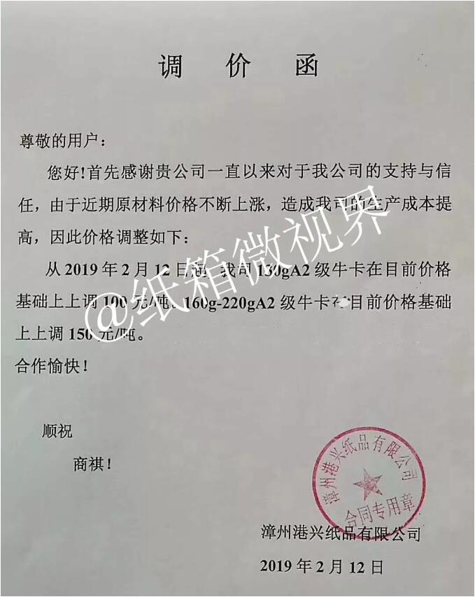 2月12日,漳州港興紙品有限公司發布漲價函: 自2019年2月12日起,130gA2級牛卡在目前價格基礎上上調100元/噸。160g-220gA2牛卡在目前價格基礎上上調150元/噸。