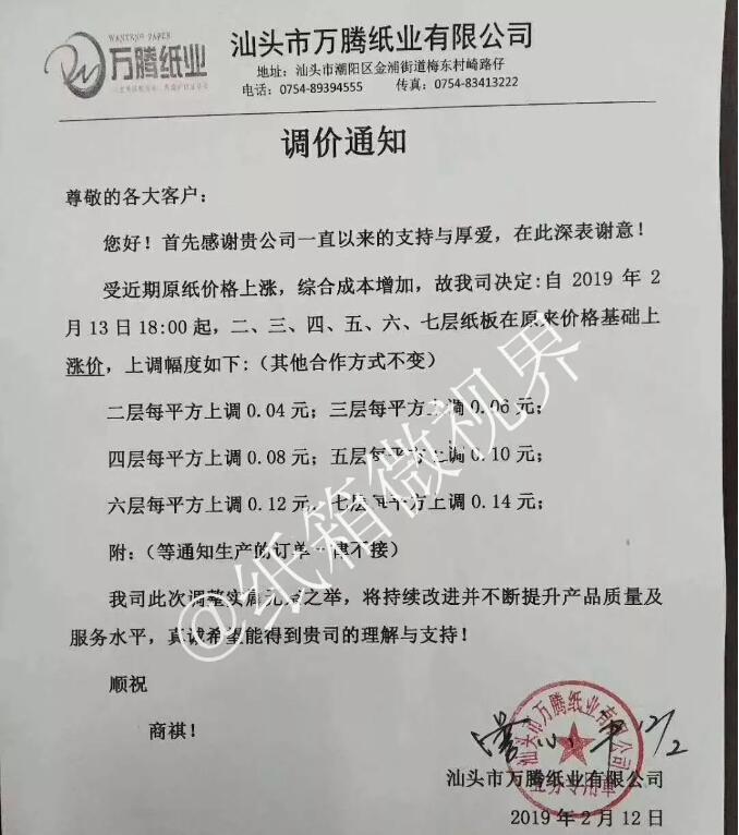 2月14日,揭陽市揭東嘉林紙品有限公司發布漲價函: 自2019年2月14日下午17:30起: 三層紙板上漲0.06元/平方 四層紙板上漲0.08元/平方 五層紙板上漲0.10元/平方 六層紙板上漲0.12元/平方 七層紙板上漲0.14元/平方 待通知生產的訂單一律不接。