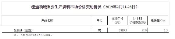 一、瓦楞紙價格連續(xù)漲近80天,統(tǒng)計(jì)局?jǐn)?shù)據(jù)重新沖擊4000元/噸大關(guān) 2019年3月4日,國家統(tǒng)計(jì)局公布最新一期流通領(lǐng)域重要生產(chǎn)資料市場價格變動情況(2019年2月21-28日)。 數(shù)據(jù)顯示,截至2月底,高強(qiáng)瓦楞紙的價格已經(jīng)上漲到3889.3元/噸。