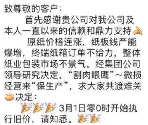 盡管上游原紙廠家仍在孜孜不倦地推漲紙價(jià),但抵不住一片冰冷的市場(chǎng)。這不,繼數(shù)日前傳出有紙板廠回調(diào)價(jià)格割肉喂鷹之后,又有多家紙板廠被逼以降價(jià)換取訂單了!