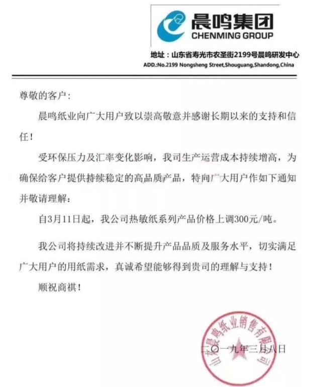 春節后經銷商及下游印廠補庫存,并且每年3月出版社為秋季教材招標,文化紙將迎來了春季小旺季。回顧2月末,國內包括晨鳴、華泰、APP、太陽、亞太森博、中冶銀河、江河、大河等多家主要雙膠紙、銅版紙廠商相繼發布提價通知,提價多自3月1日起執行,漲幅仍為200元/噸。 第一輪提價函 雙膠紙、銅版紙提價,雙膠紙部分落地。1月中旬起,雙膠紙、銅版紙密集發布2月提價函,分別提價200元/噸、100元/噸,截止目前雙膠紙已經基本落地50-150元/噸,但銅版紙提價暫未落地。 第二輪提價函 銅版紙、白卡紙已發提價函,落地幅度有待觀察。節后漿紙系紙企再次密集發布銅版紙、白卡紙3月提價函,提價200元/噸。雙膠紙2月份價格回調,終端漲幅落實100-200元/噸。市場顯露短期回暖跡象,多家紙廠推漲3月價格意向堅定,3月出廠價漲幅仍為200元/噸。 第三輪提價函 晨鳴、APP、江河紙業在昨天均發布了最新的漲價函,宣布熱敏紙、復印紙、無碳復寫紙等將上調價格,漲價幅度最高為300元/噸。 山東晨鳴紙業銷售有限公司