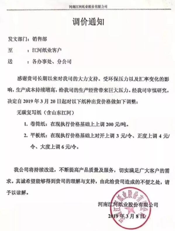 受環保壓力及匯率變化影響,自3月11日起,我公司熱敏紙系列產品價格上調300元/噸。 河南江河紙業股份有限公司 受環保壓力以及匯率變化的影響,自3月20日起對以下紙種出貨價格作如下調整:無碳復寫紙(含山東江河)1、卷筒紙:在現執行價格基礎上上調200元/噸。2、平板紙:在現執行價格基礎上對開上調3元/令、正度上調4元/令、大度上調6元/令。 APP