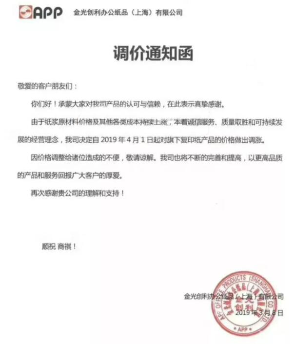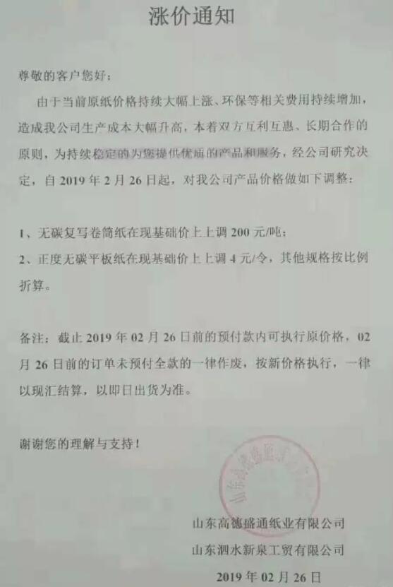 由于紙漿原材料價格及其他各類成本持續上漲,本著誠信服務、質量取勝和可持續發展的經營理念,我司決定自2019年4月1日起對旗下復印紙產品的價格做出調漲。 山東高德盛通紙業/山東泗水新泉工貿有限公司