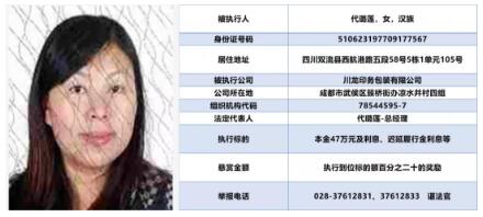 懸賞理由:本院在執(zhí)行申請執(zhí)行人肖某與被執(zhí)行人代璐蓮、川龍印務(wù)包裝有限公司借款合同糾紛一案中,被執(zhí)行人代璐蓮、川龍印務(wù)包裝有限公司拒不履行生效法律文書所確定的義務(wù),申請執(zhí)行人向本院申請懸賞執(zhí)行,依照《最高人民法院關(guān)于民事執(zhí)行中財產(chǎn)調(diào)查若干問題的規(guī)定》第二十二條之規(guī)定,本院特發(fā)布執(zhí)行懸賞公告。